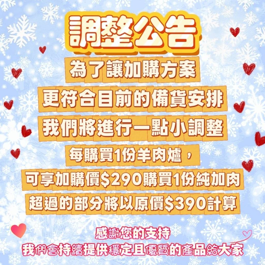 調整公告 為了讓加購方案更符合目前的備貨安排 我們將進行一點小調整 ★每購買1份羊肉爐可享加購價$290購買1份純加肉 超過的部分將以原價$390計算 感謝您的支持 我們會持續提供穩定且優質的產品給大家