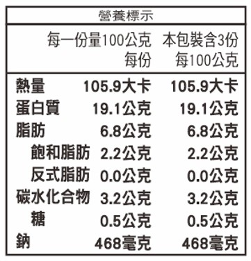 成分:水,羊肉,辣豆瓣〈黃豆(非基因改造)、辣椒、水、鹽、砂糖、黏稠劑(乙醯化己二酸二澱粉、玉米糖膠)、甜味劑(醋磺內酯鉀)、調味劑(L-麩酸鈉、琥珀酸二鈉)、己二烯酸鉀、品質改良劑(偏磷酸鈉)、著色劑(食用紅色四十號)〉,醬油,薑,香油,冰糖,八角,花椒,鹽,L-麩酸鈉,味噌〈白米、黃豆(非基因改造)、食鹽、辣椒粉、己二烯酸鉀〉。
