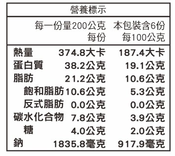 成分:鴨、辣椒醬(辣椒.水.鹽.砂糖.麻油(黃豆油.芝麻油).黏稠劑(乙醯化己二酸二澱粉.玉米糖膠).調味劑(L-麩酸鈉.琥珀酸二鈉).甜味劑(醋磺內酯鉀.甘草萃).己二烯酸鉀1.0g/kg以下.品質改良劑(偏磷酸鈉).著色劑(食用紅色七號.四十號)、醬油、米酒、鹽、糖、L-麩酸鈉、肉桂、八角、花椒。